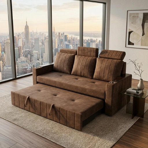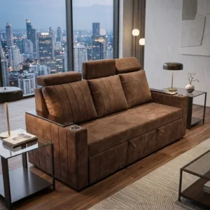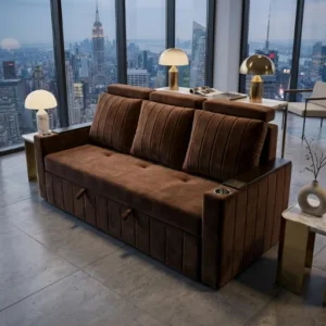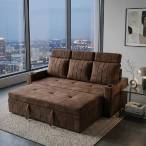 Multi-functional sofa that converts into a bed with storage and premium armrest features.