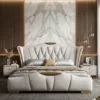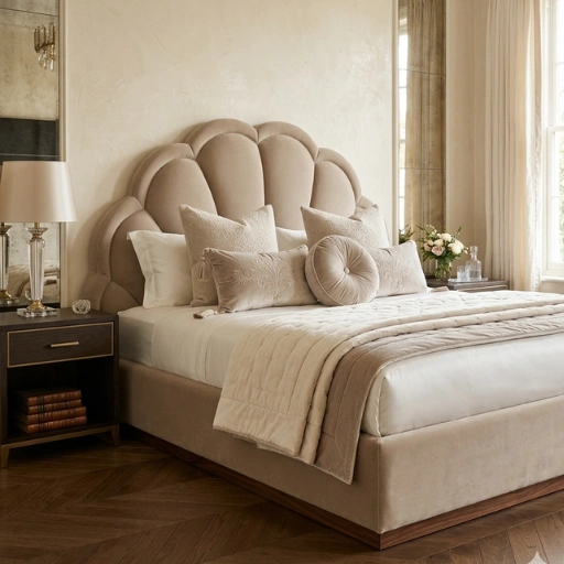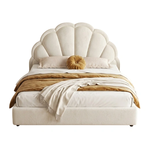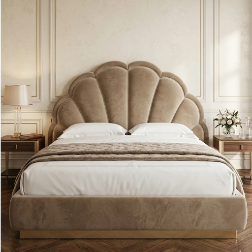 Elegant shell-shaped headboard bed with premium upholstery and modern luxury finish for stylish bedrooms.